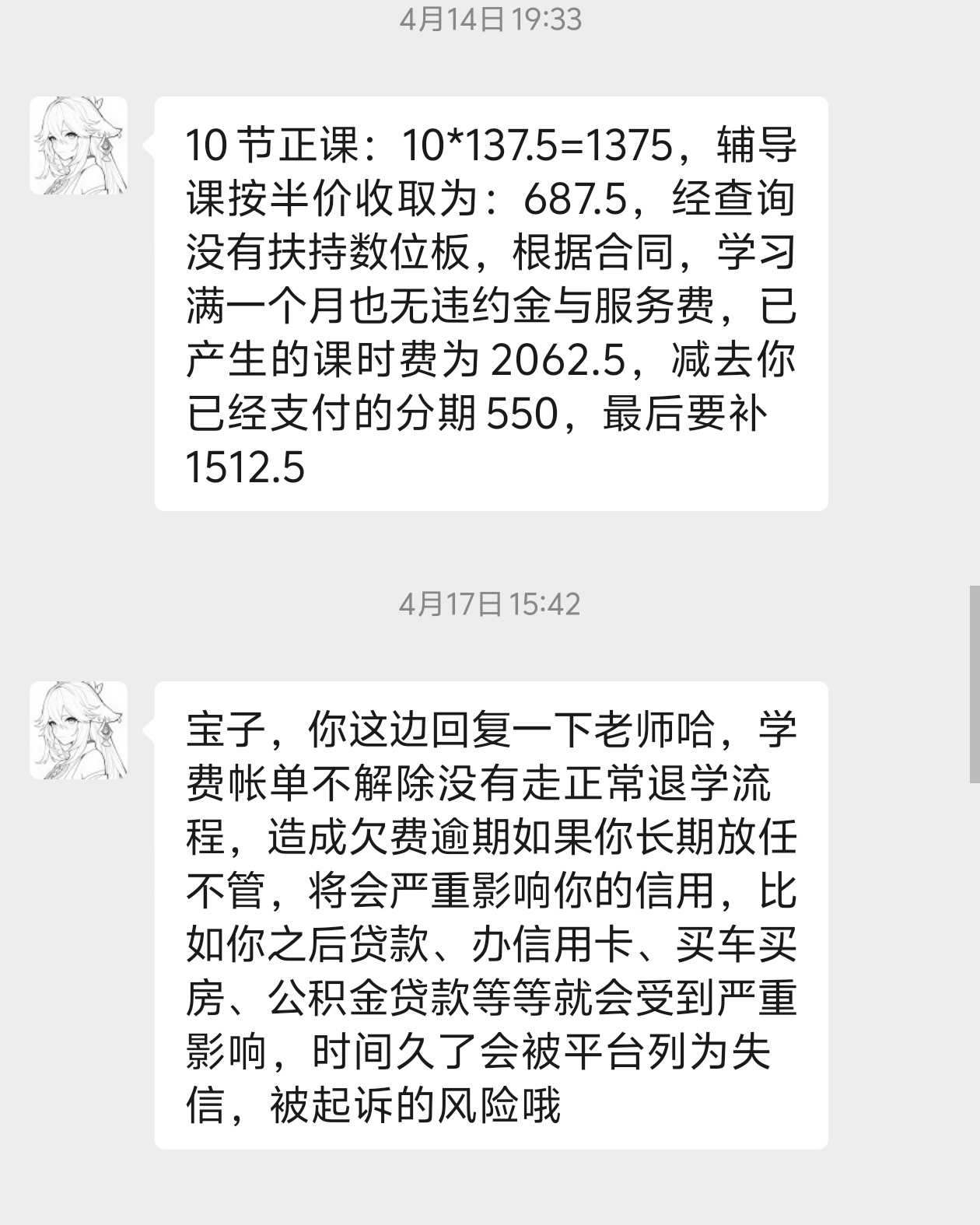 二月份的时候我在小红书上面看见有画画兼职的帖子,就加了微信,夸的天花乱坠,说是很轻松就能赚够一个月的学费,他们诱导消费,我就信了,但其实工作量很大特别累,接稿之前需要试稿,试稿成功了以后才能开始接稿,接的稿子特别少稿费也特别少,接了稿子之后还需要让老师一次次的改,浪费时间太多。我就接了一次稿子,稿费也没给我打过来。4月份我想退学(已经交了一期了)解除分期时,又让我付很多的违约金这都是之前没有明面上说过的,这就是虚假宣传,诱导消费,霸王条款。我看他们机构老师发的朋友圈有起诉的有点害怕